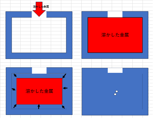 図のように外側から徐々に固まっていきますが、体積は減少するため、最後に固まった部分(最終凝固点)が空洞になってしまい、これを「引け巣」と呼びます。